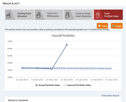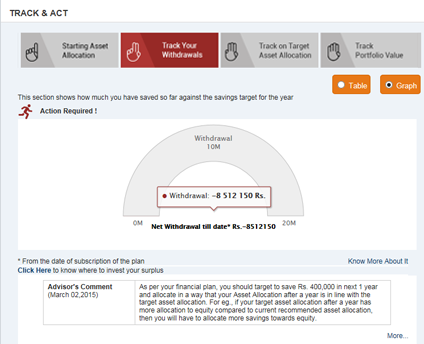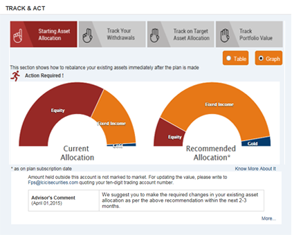 Once we collect the information on your goals, current financial assets, income and other details, we work on a customized retirement plan for you. Our recommended financial action plan gives you a savings rate to adhere to, an optimal asset allocation to do an immediate re-balancing, and a target asset allocation for future investments. Your allocations can also be tracked online so that you can invest based on an action plan, which is based on your goals and a scientific approach.